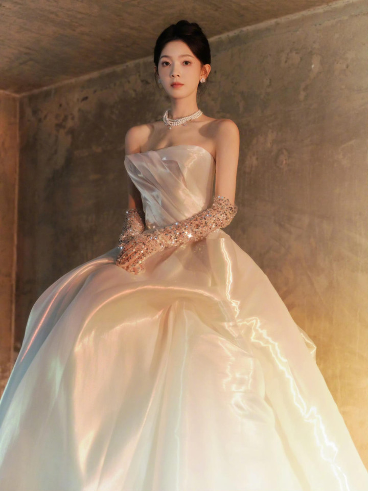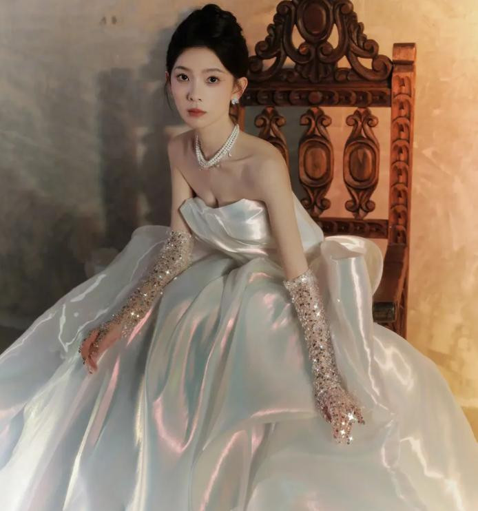 裙子上的珠光细闪在灯光下会变色,一会儿像珍珠,一会儿像彩虹,难怪话题#陈瑶五彩斑斓的白#能冲上热搜。