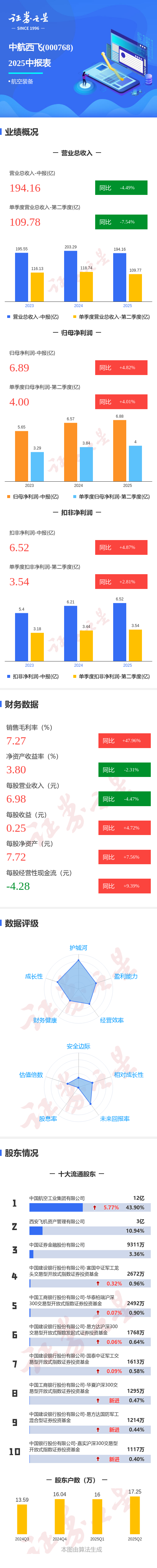 证券之星消息,中航西飞2025年中报显示,公司主营收入194.16亿元,同比下降4.49%;归母净利润6.89亿元,同比上升4.83%;扣非净利润6.52亿元,同比上升4.88%;其中2025年第二季度,公司单季度主营收入109.78亿元,同比下降7.55%;单季度归母净利润4.0亿元,同比上升4.02%;单季度扣非净利润3.54亿元,同比上升2.81%;负债率70.68%,投资收益2198.42万元,财务费用-6769.16万元,毛利率7.27%。